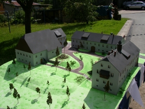 | Zu unserem Dorf- u. Heimatfest rollte dann das Freigut auf zwei Rädern durch Albernau. Das war keine Zauberei, sondern ein Modell, welches ich in ca. 150 Stunden Bastelarbeit für den Festumzug angefertigt habe. Im Maßstab 1:45 ist das Modell komplett 1,50 m breit und 1,2 m lang. Immer wieder habe ich die Zeichnungen und Skizzen, mit den alten Luftaufnahmen verglichen und bin zu diesen Grundrissen gekommen. Vier große Gebäude umsäumen den "Drei-Seiten-Hof": Das Herrenhaus, der sog. Pferdestall, das Gerätehaus und die Scheune u. Kleintierstall. |